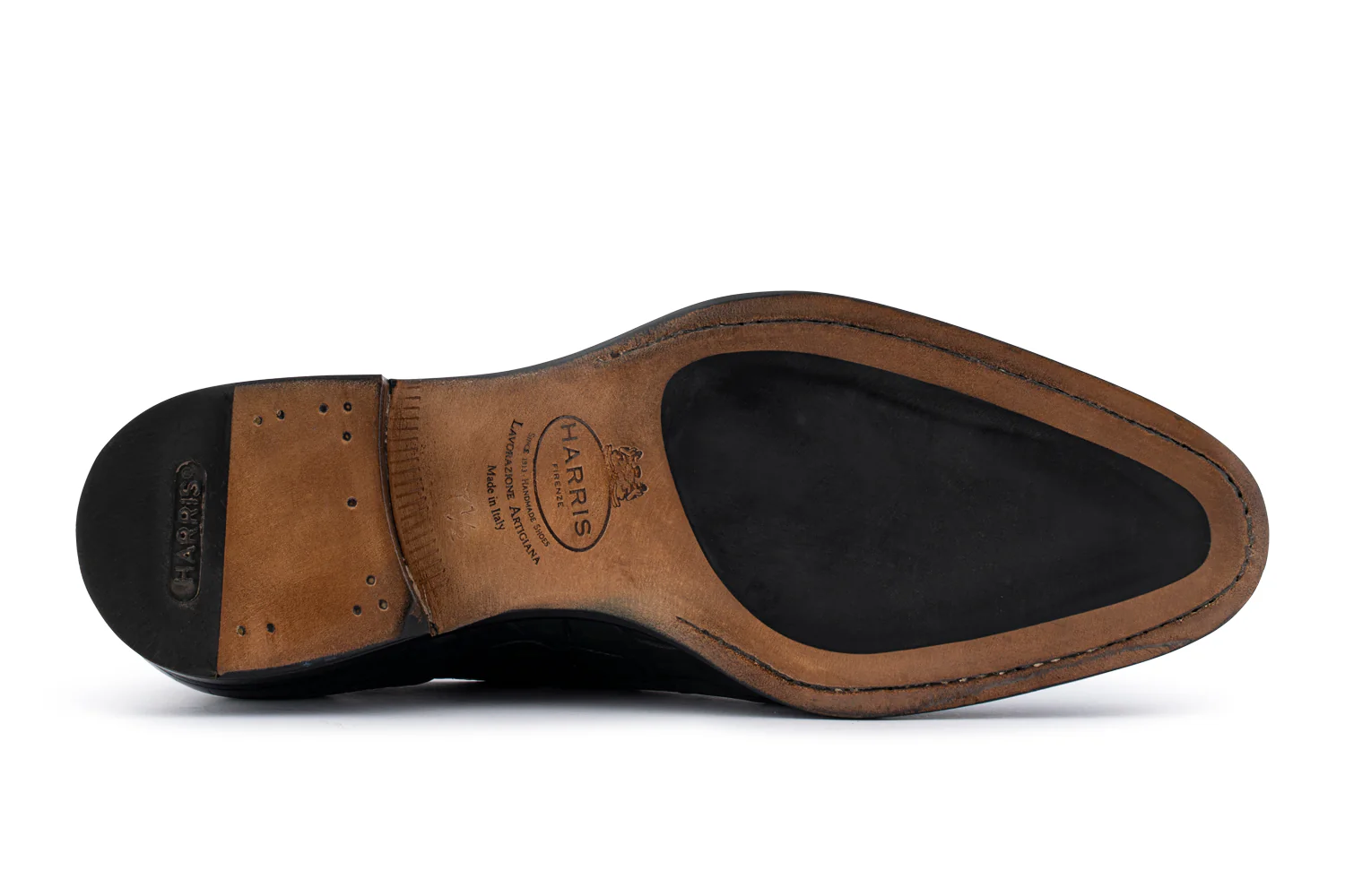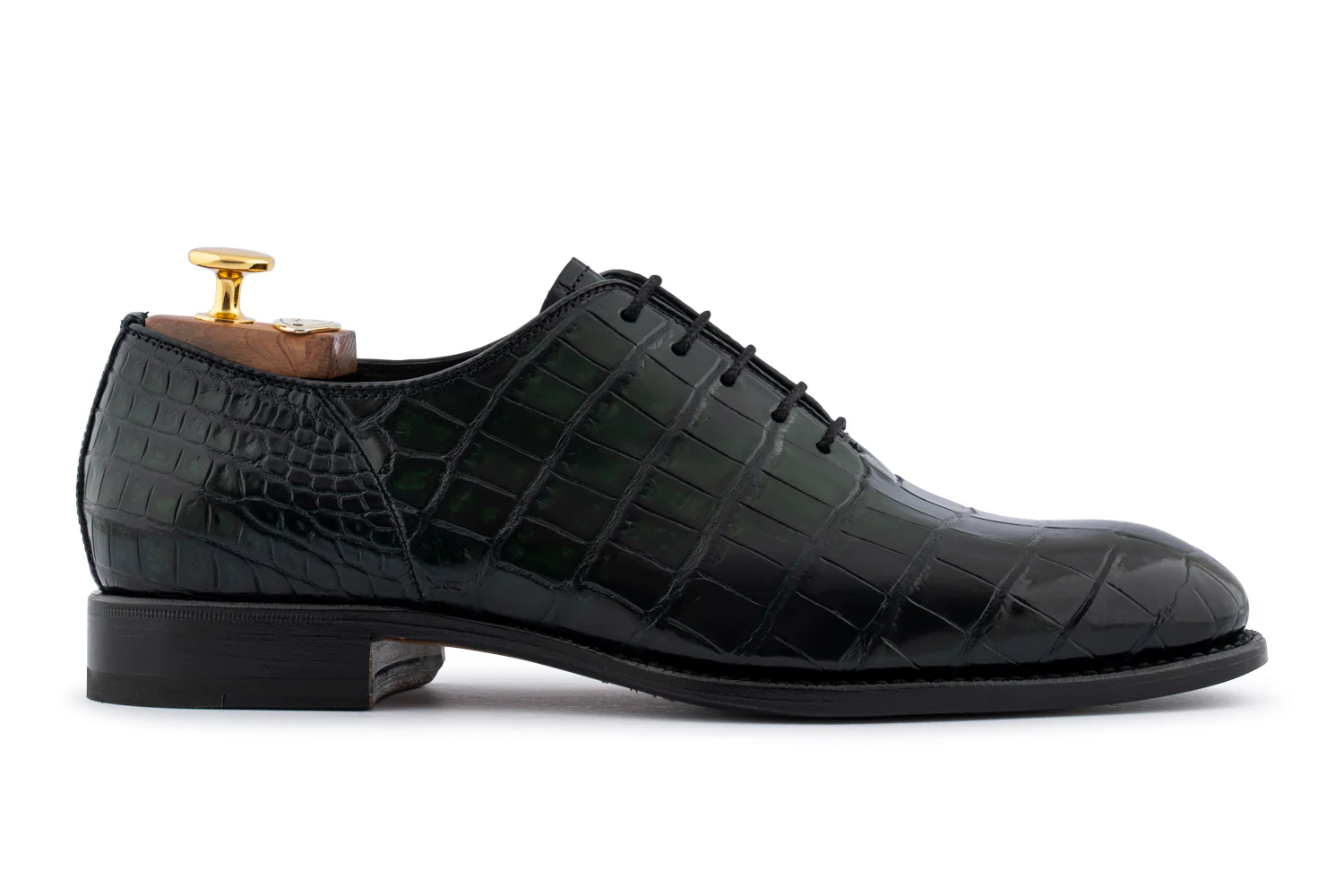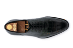 Scarpa in vera pelle di coccodrillo dipinta a mano, color marrone, con dettagli sfumati che ne esaltano la texture unica. Lavorazione Blake rapida, suola in cuoio con inserto in gomma antiscivolo per il massimo comfort e stabilità. Un classico senza tempo, perfetto per chi cerca lusso e artigianalità in ogni dettaglio.