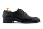 Scarpa in vera pelle di coccodrillo dipinta a mano, colore verde smeraldo, con dettagli sfumati che ne esaltano la texture unica. Lavorazione Blake rapida, suola in cuoio con inserto in gomma antiscivolo per il massimo comfort e stabilità. Un classico senza tempo, perfetto per chi cerca lusso e artigianalità in ogni dettaglio.