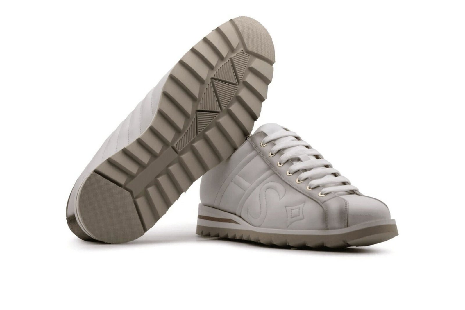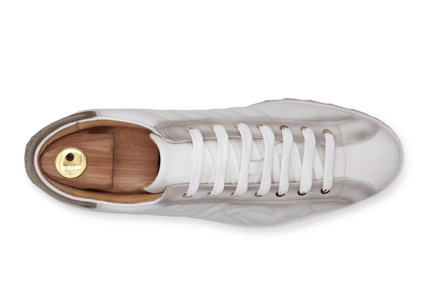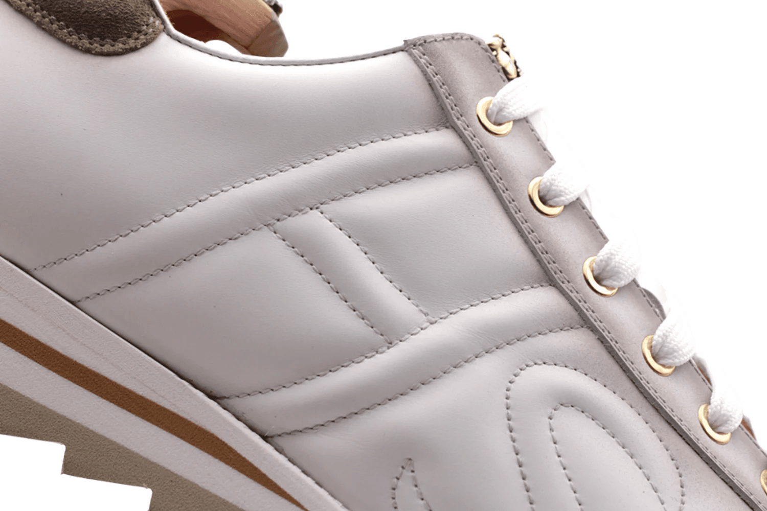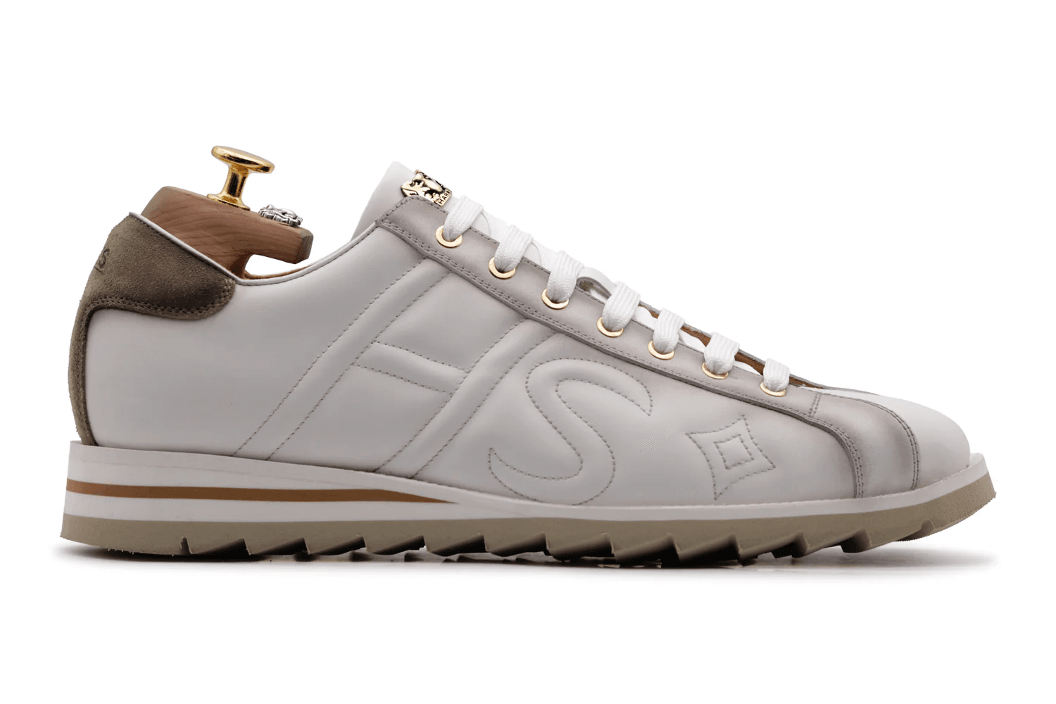 Dieser Harris-Sneaker vereint Reinheit und Eleganz. Er ist aus weißem, glattem Kalbsleder gefertigt und mit handbemalten Farbtönen verziert. Das seitlich gestickte HS-Logo unterstreicht die Markenidentität, während die Wildlederdetails einen raffinierten Materialkontrast bilden. Goldfarbene Accessoires verleihen dem Design einen Hauch exklusiven Glanzes, und die Runner-Gummisohle garantiert täglichen Tragekomfort ohne Kompromisse beim Stil.