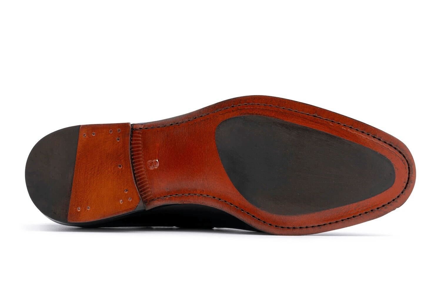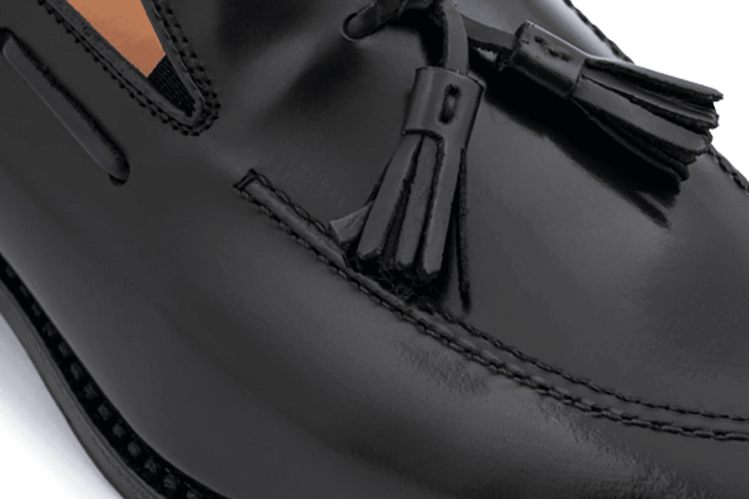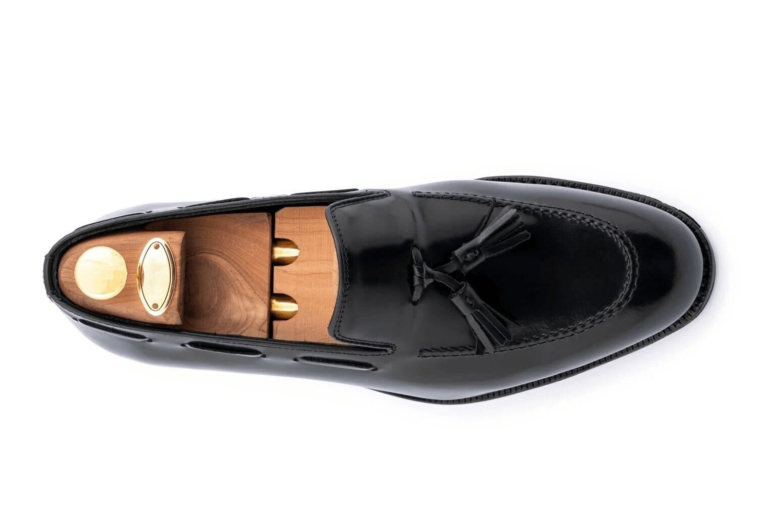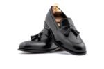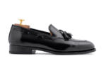 Das Obermaterial ist vollständig aus schwarzem, gebürstetem Leder gefertigt und mit dekorativen Quasten und Ziernähten versehen, die seine elegante Silhouette unterstreichen.