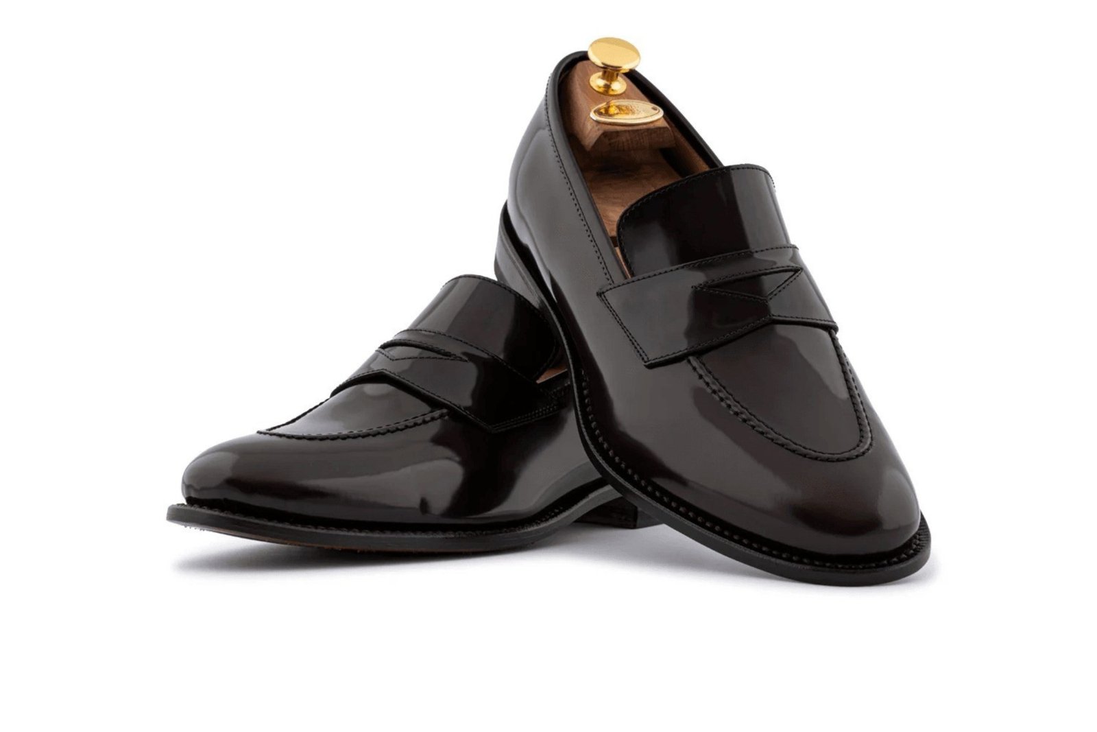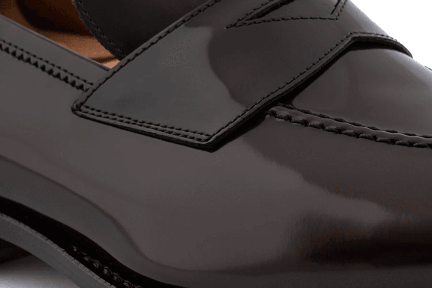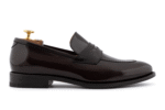 Dieser Loafer ist aus poliertem, gebürstetem Kalbsleder in einem edlen Burgunderrot gefertigt und mit einer Lederschlaufe sowie sichtbaren Ziernähten am Rand verziert – ein Markenzeichen italienischer Schuhtradition.