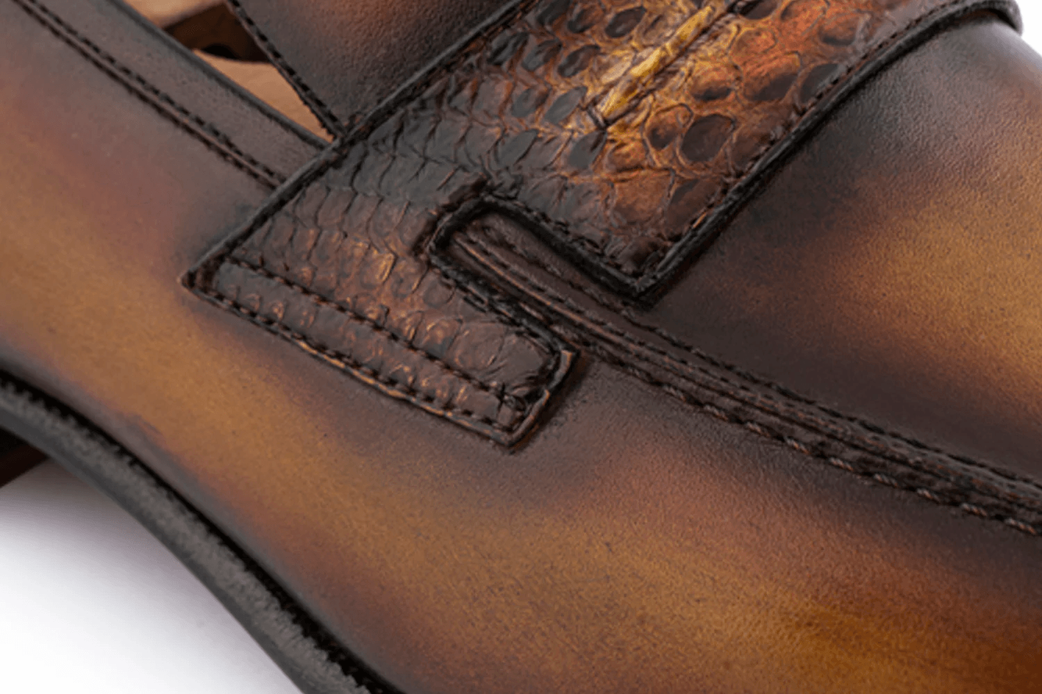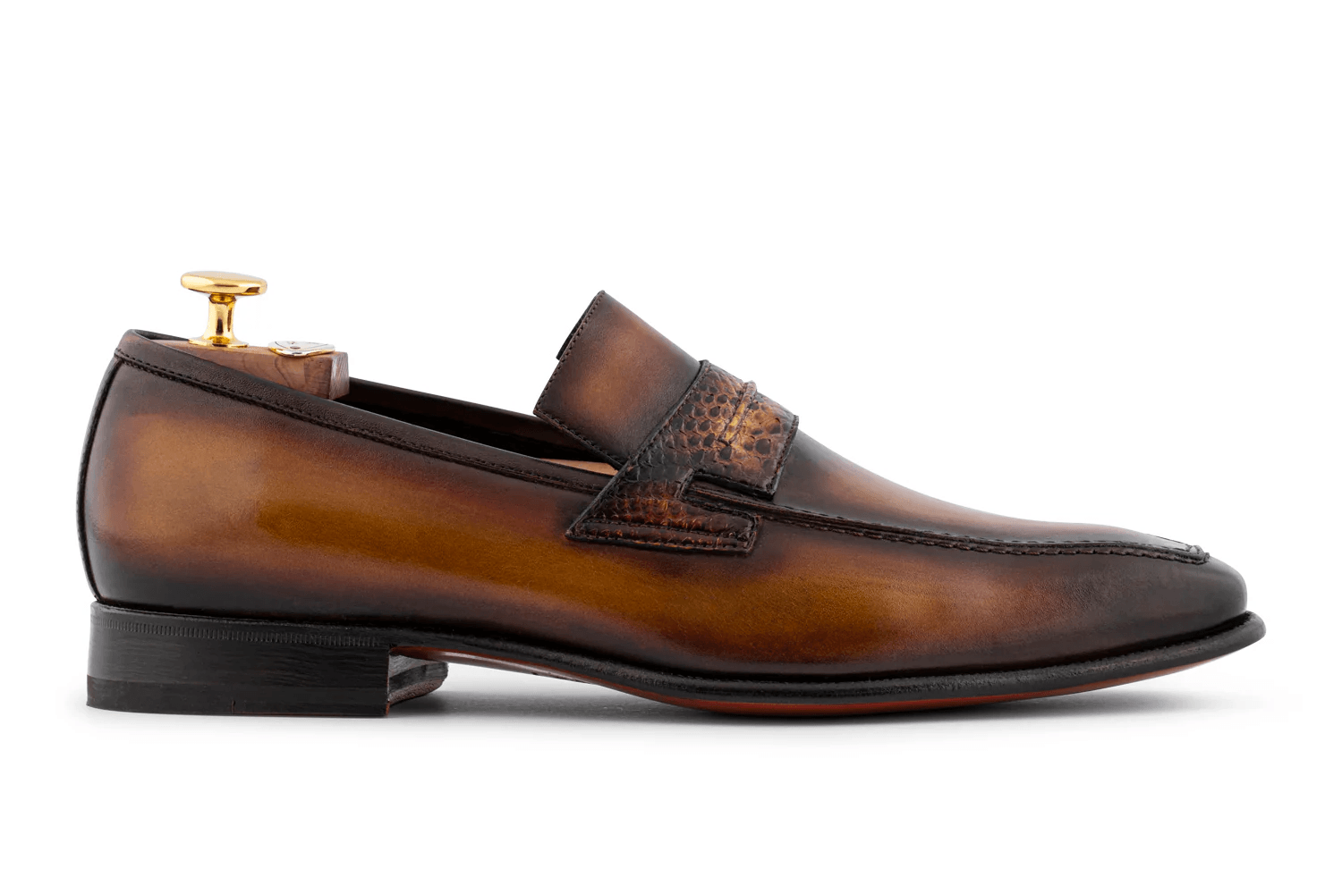 Dieser Loafer ist aus handbemaltem Vollnarbenkalbsleder gefertigt und besticht durch einen raffinierten Schattierungseffekt, der die hochwertige Verarbeitung unterstreicht. Eine Schlaufe aus Pythonleder und eine Ledersohle runden den Look ab und verleihen dem Schuh einen Hauch von Eleganz und Raffinesse.